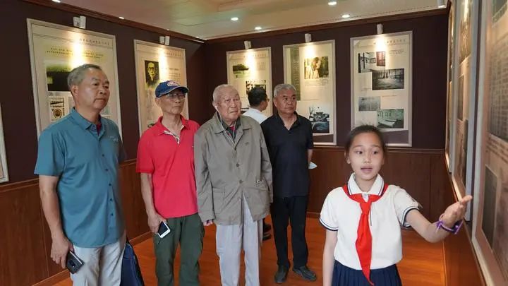6月9日,上海市浦东新区南汇新城镇秋萍学校,周到(左三)在其儿子们陪同下参观位于学校内的周大根烈士事迹陈列馆。本报记者 杨有宗 摄