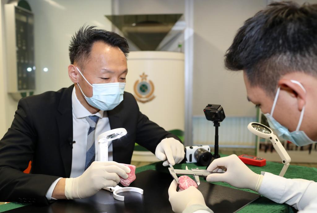 香港海关情报科监督刘玉龙(左)和同事察看玉石(8月18日摄)。新华社记者 李钢 摄