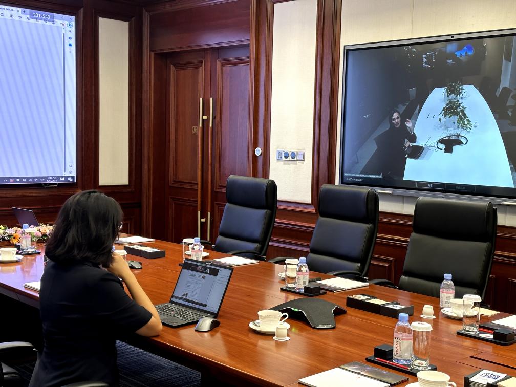 当地时间8月17日晚,在墨西哥首都墨西哥城,华为墨西哥公共关系与对外沟通经理萨米拉·埃雷拉·佩雷斯和华为TECH4ALL数字包容项目办公室的项目经理曾铭(屏幕居中)进行视频连线。新华社发(弗朗西斯科·卡涅托摄)