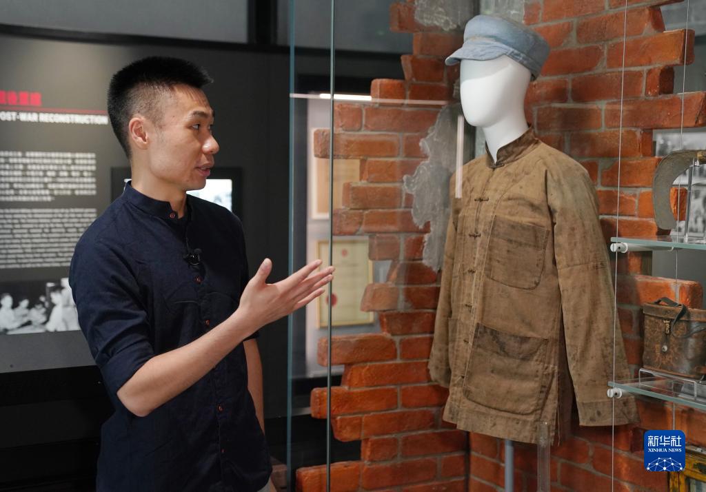 香港海防博物馆二级助理馆长杨汶翘向新华社记者介绍博物馆展厅中东江纵队港九独立大队成员抗战时的穿戴装束(8月24日摄)。 新华社记者 王申 摄