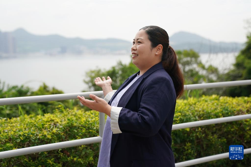 香港海防博物馆一级助理馆长梁明颖向新华社记者介绍香港海防博物馆独特的地理位置(8月10日摄)。 新华社记者 王申 摄