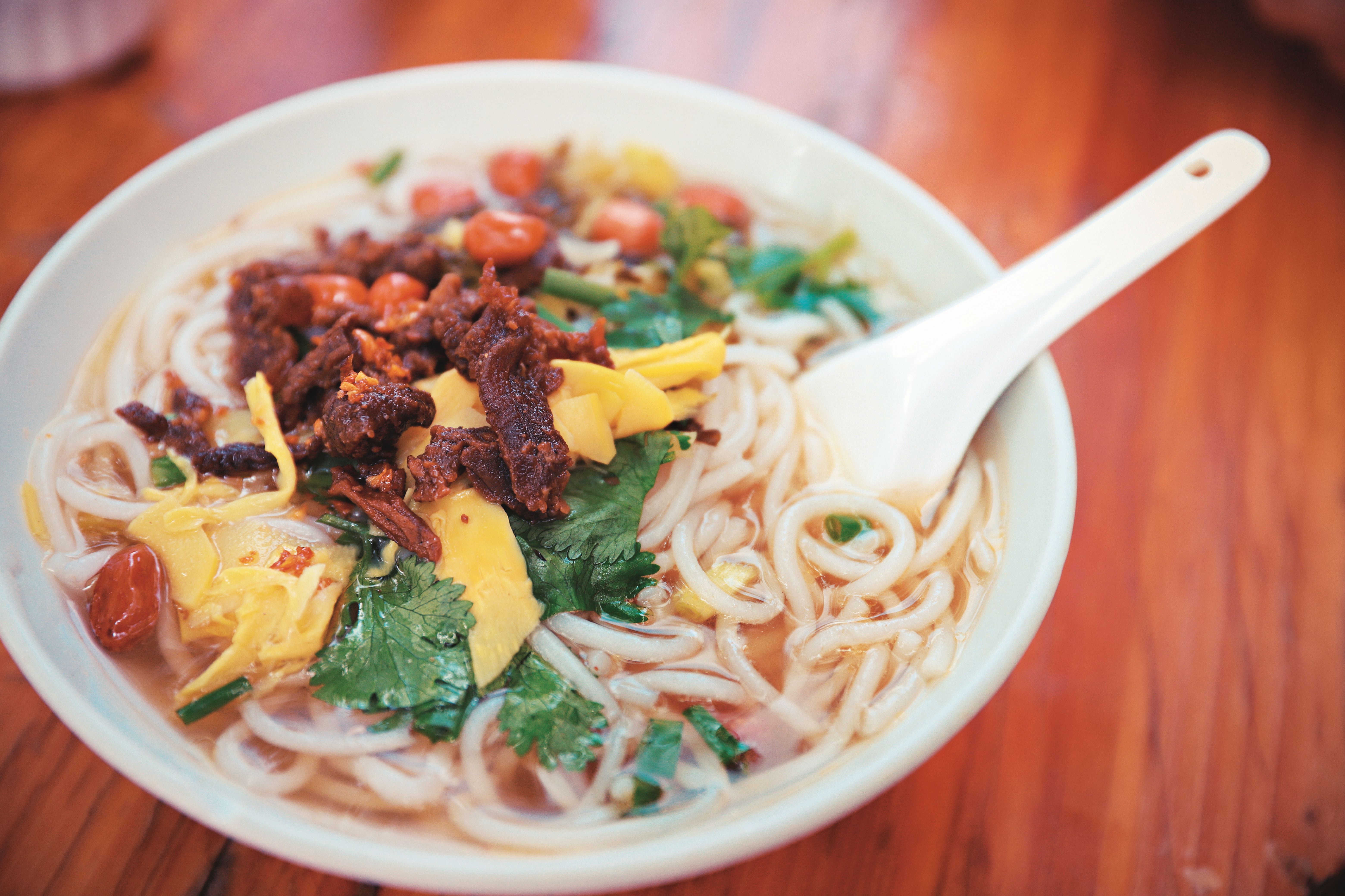 除汤粉食法外,还有干拌食法。干拌时,配上特制的卤汁、牛肉干、花生米、芝麻仁、竹笋、酸菜、豆芽及芝麻油或花生油,加入少许辣椒粉或胡椒粉,鲜美滑嫩,喷香可口,令人百食不厌。