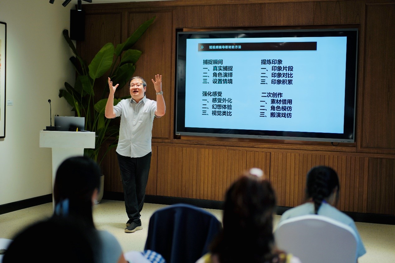 上海温哥华电影学院副院长陈晓达以《手机短视频的概念机制与摄制创作入门》为主题为学员生动地讲述了专业的短视频拍摄技巧。他从电影制作的角度切入,由电影短片的分类、电影创作的四个部分讲起,引申到当下火热的短视频制作。