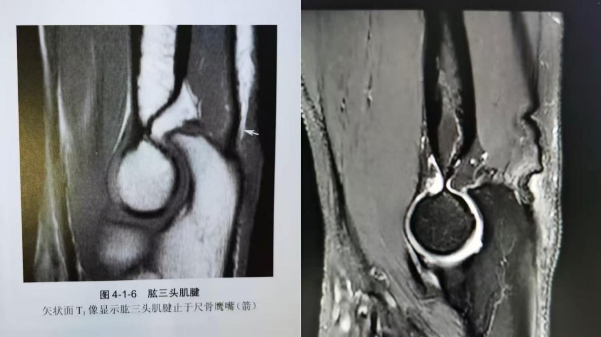 右侧为ct图,可见肱三头肌腱出现裂口(图/杭州师范大学附属医院)