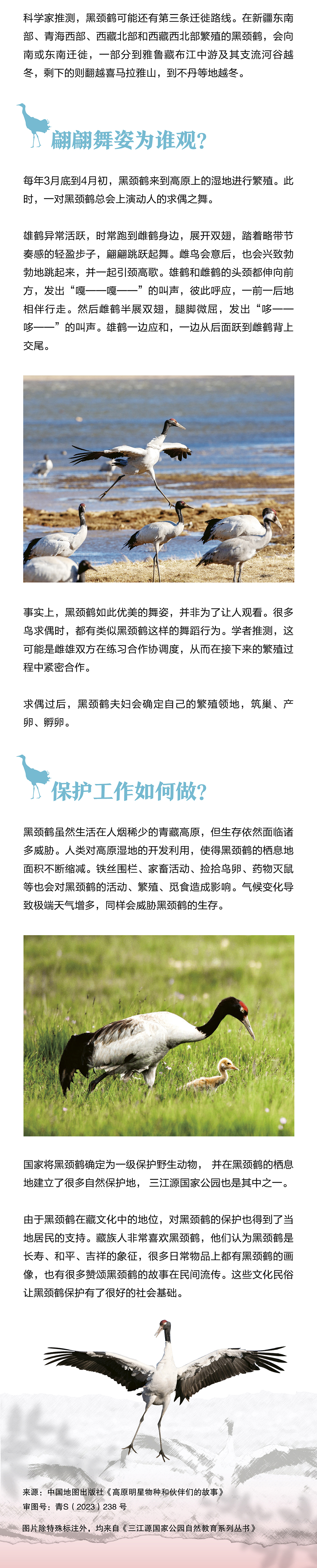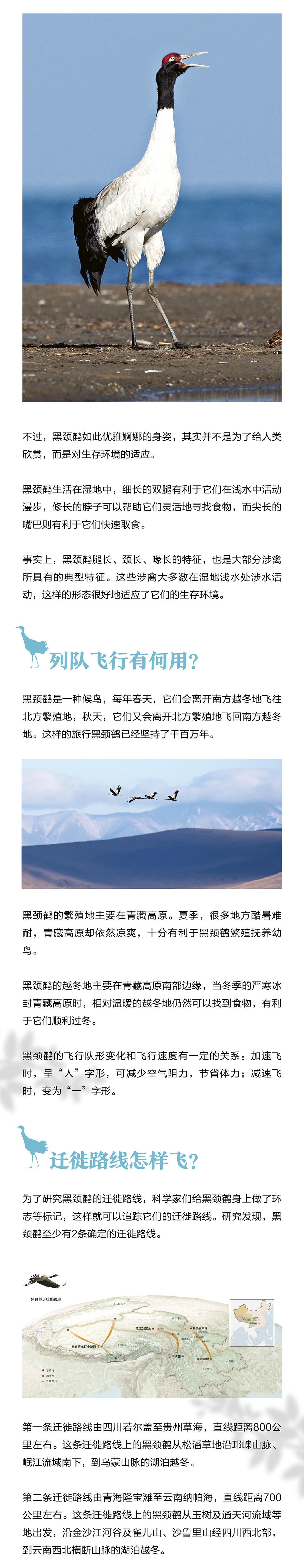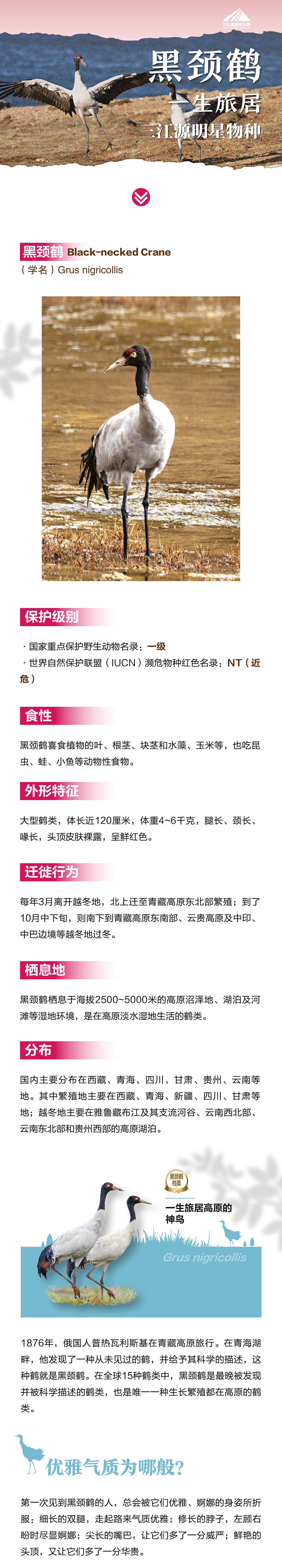 第一次见到黑颈鹤的人,总会被它们优雅、婀娜的身姿所折服:细长的双腿,走起路来气质优雅;修长的脖子,左顾右盼时尽显婀娜;尖长的嘴巴,让它们多了一分威严;鲜艳的头顶,又让它们多了一分华贵。