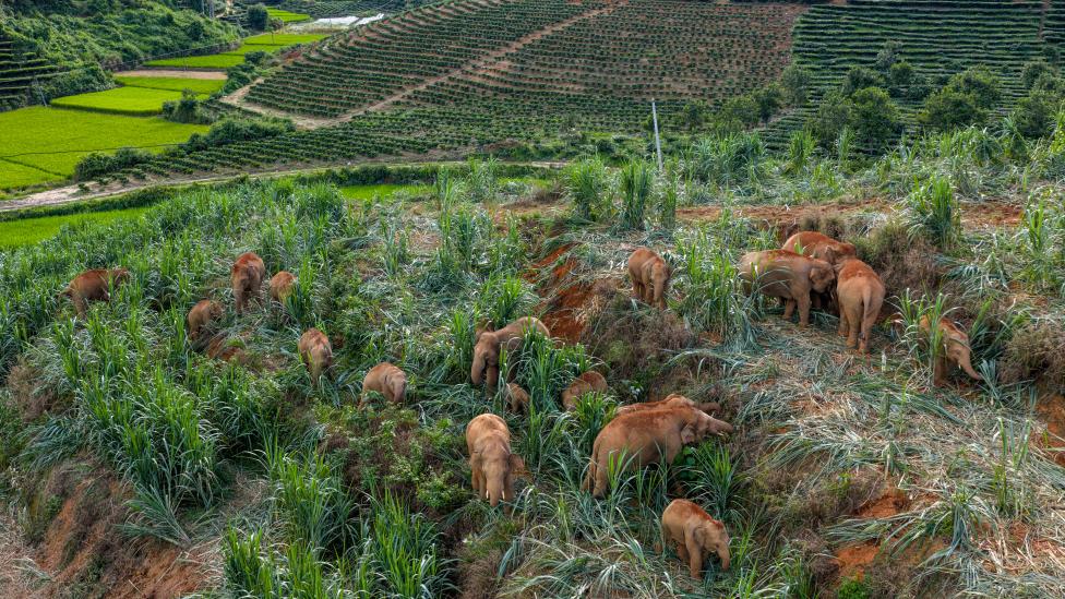 “然然家族”野象在云南省西双版纳州景洪市大渡岗乡觅食(无人机照片,2025年8月9日摄)。新华社记者胡超