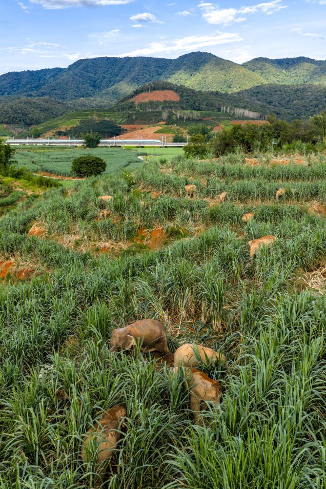 “然然家族”野象在云南省西双版纳州景洪市大渡岗乡觅食。远处,一列动车从中老铁路上驶过(无人机照片,8月10日摄)新华社记者 胡超 摄