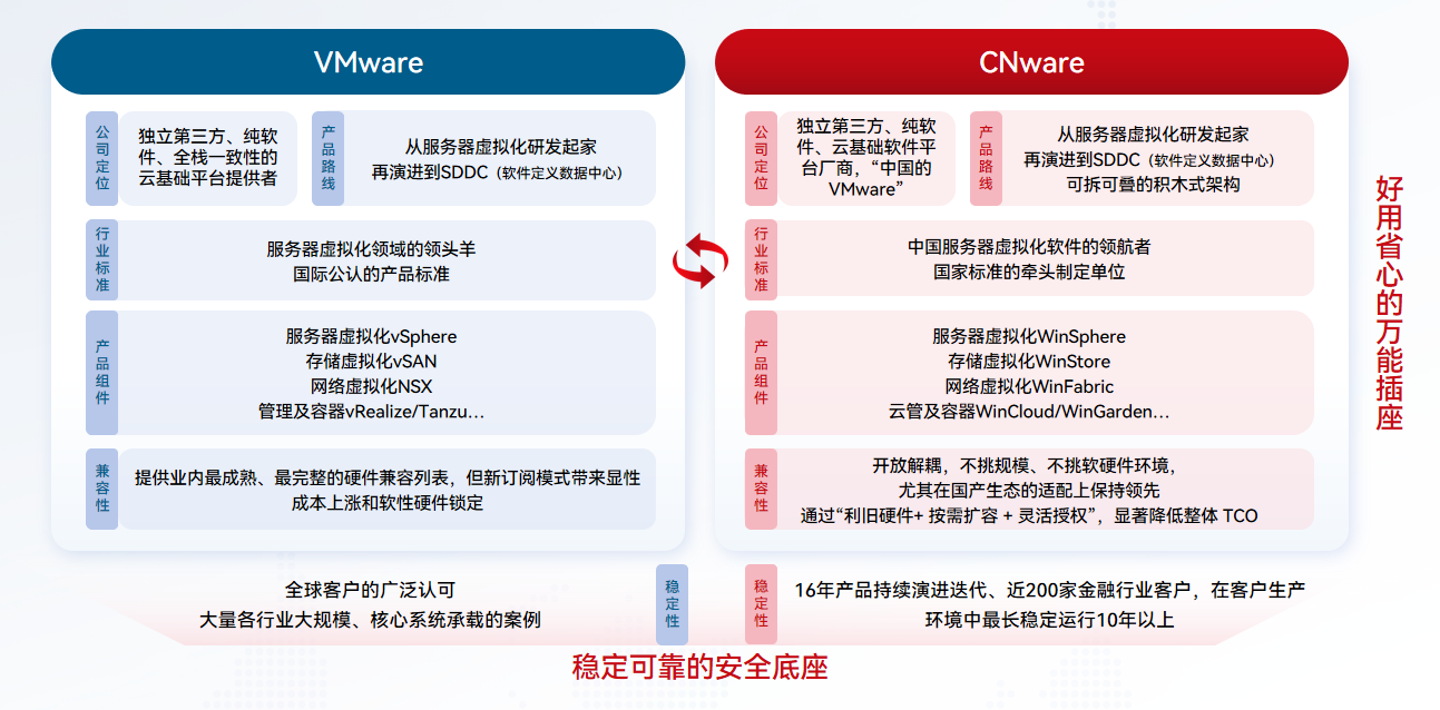 云宏CNware凭借其“无感同位替换”能力,为用户从VMware等国外虚拟化平台向国产化方案迁移提供了平滑路径。