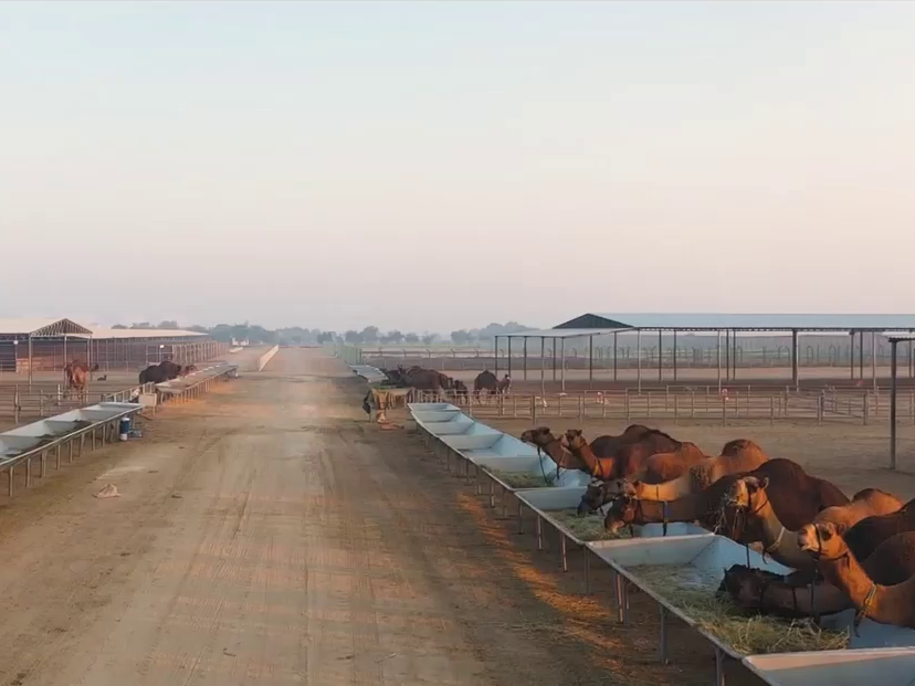 在这里的都是单峰骆驼,它们能适应炎热干燥的气候,所以生活在非洲、中东以及中亚的南部。骆驼的驼峰越少,产奶也越少。每头成年骆驼每天需食用15—20公斤牧草,牧场从世界各水草充沛地区进口优质草料投喂给骆驼,并由专业的牧医团队对谷物与草料进行二次营养配比。