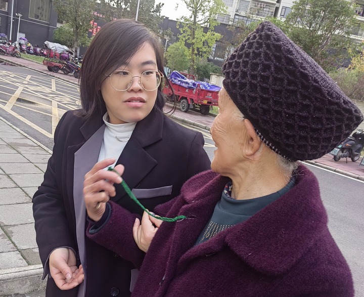 杨丹(左)送迷路的社区居民回家。(受访者供图)