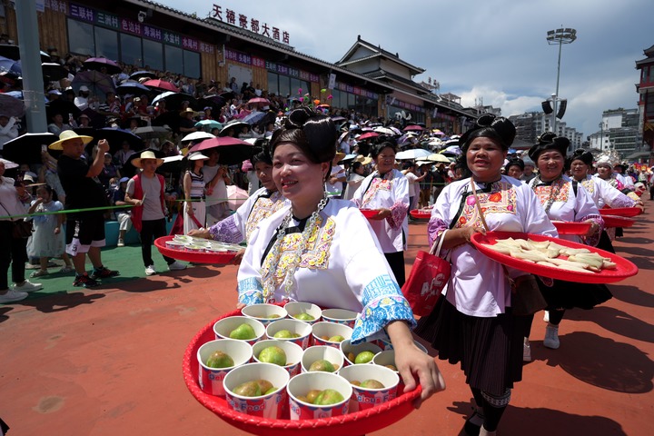 7月26日,一支啦啦队带着美食进入榕江“村超”球场。新华社发(王炳真摄)