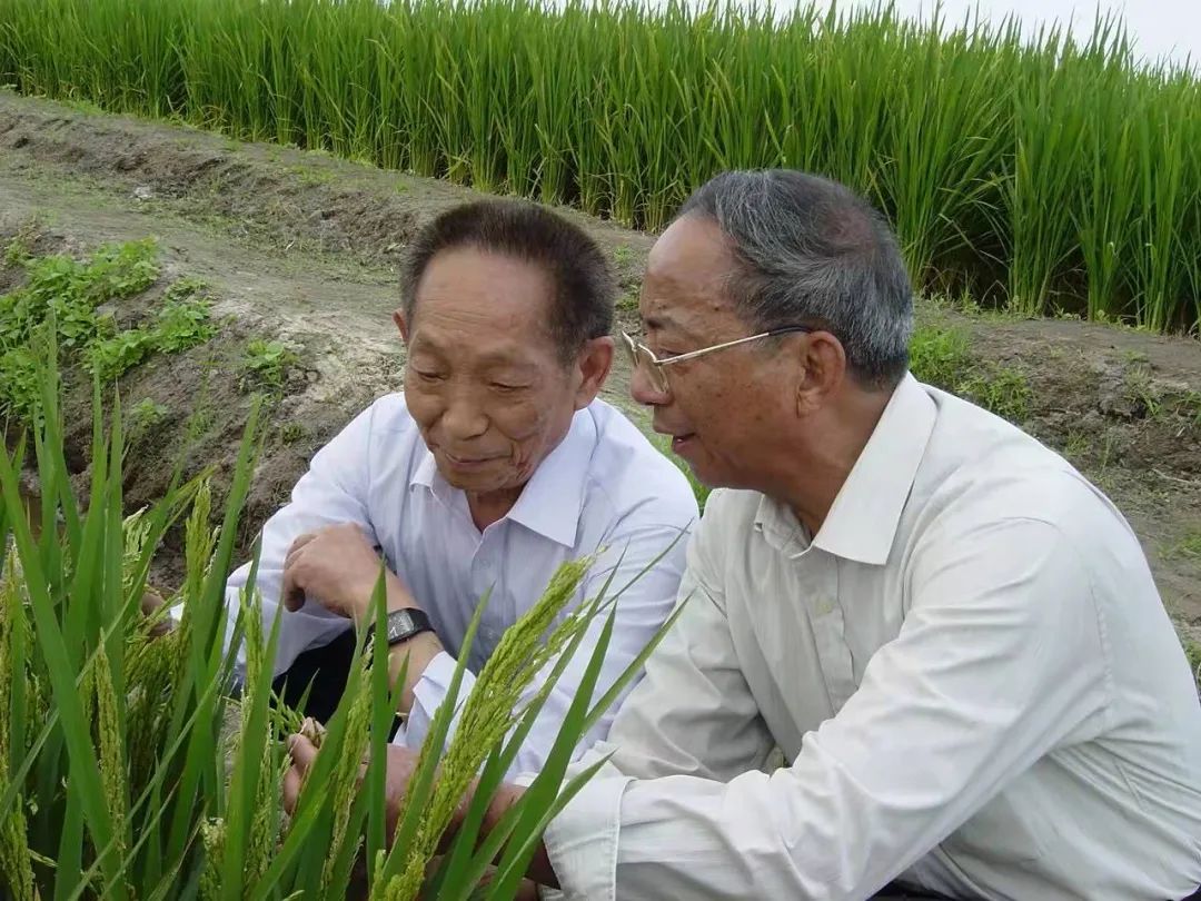 ▲20年前, 谢华安在海南省三亚市与袁隆平院士在田间观察水稻材料生长情况。