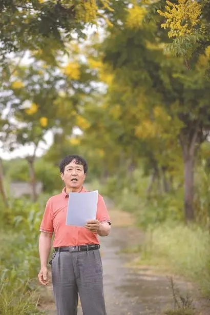 从文化活动中心出来,沿着浦星公路往前,寻到一片农田。褚桂明走进田埂间的小道上,拿出歌词本唱起《白杨村山歌》,清亮的嗓音如同云雀,一下子升到天上。“哎嘿!伊呦伊呦伊呦伊呦伊呦哎……”