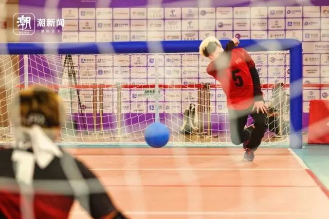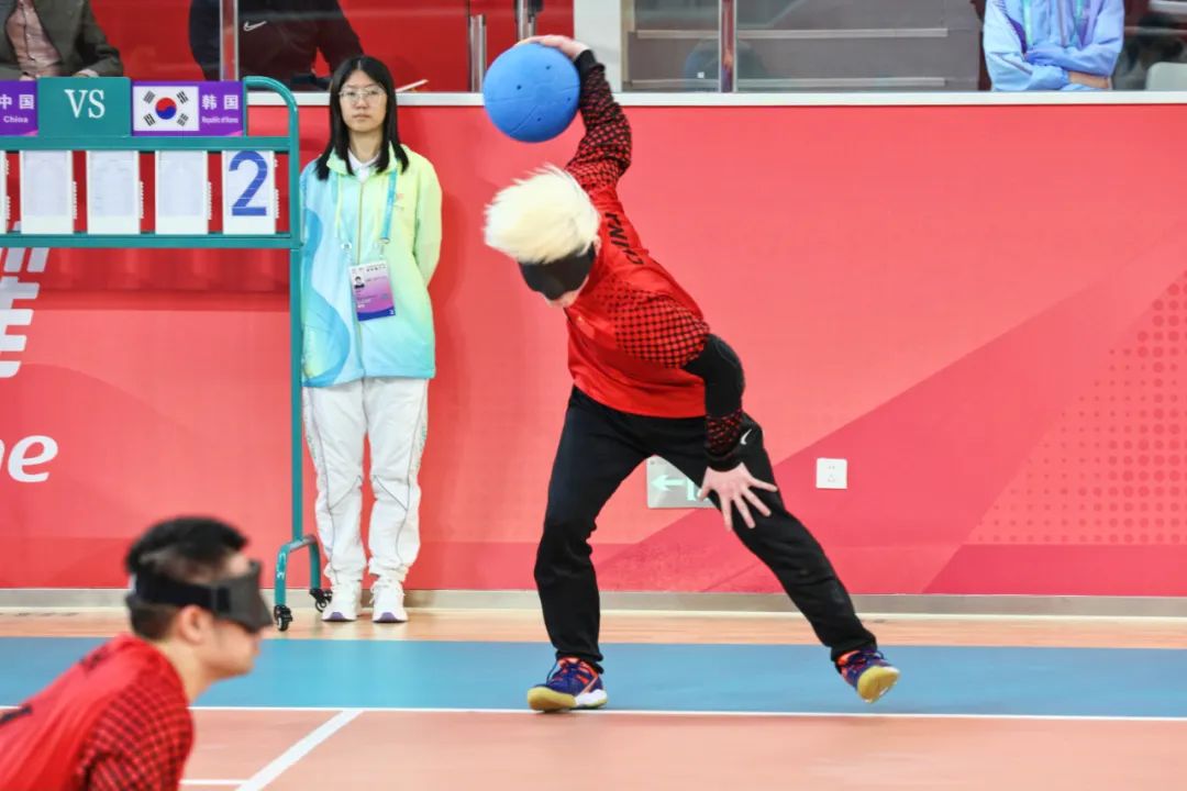 10月23日,杭州亚残运会盲人门球男子A组小组赛比赛中,中国队以10:6战胜韩国队。姚颖康 徐文迪 摄