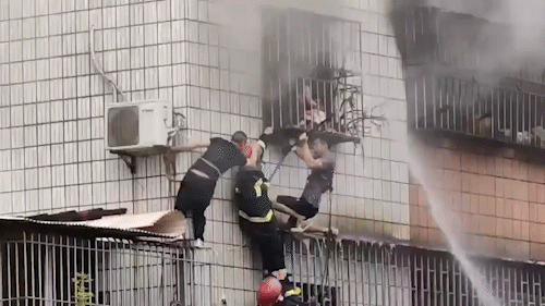 近日,广东佛山一名女子和宝宝被困火场,只能躲在窗户的防盗网处等待救援。危急时刻,3名空调维修工人出手了!