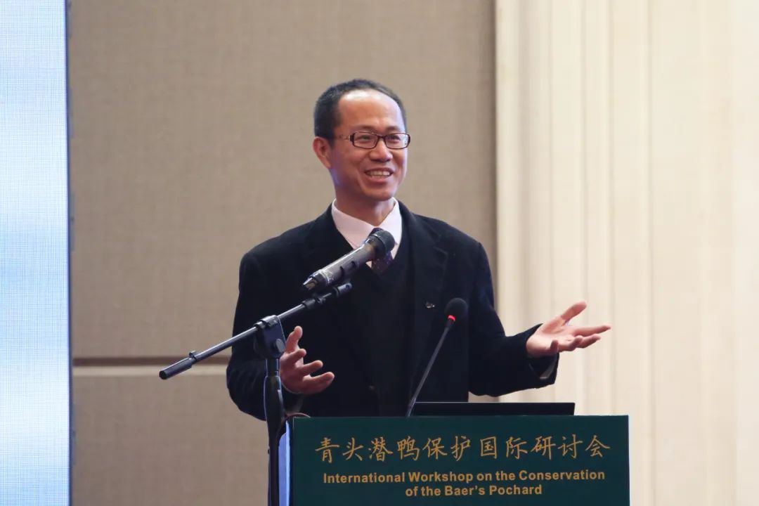 武大勇在青头潜鸭保护国际研讨会做主旨报告。图片来源:河北省文明办