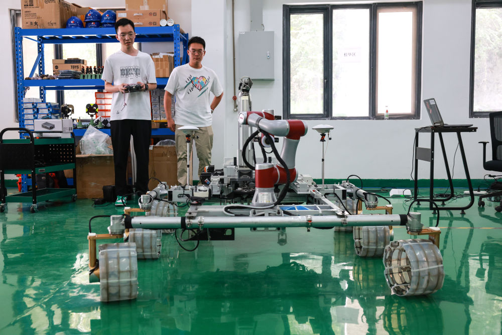↑ 2023年7月25日,工作人员在调试反射面激光靶标维护机器人。