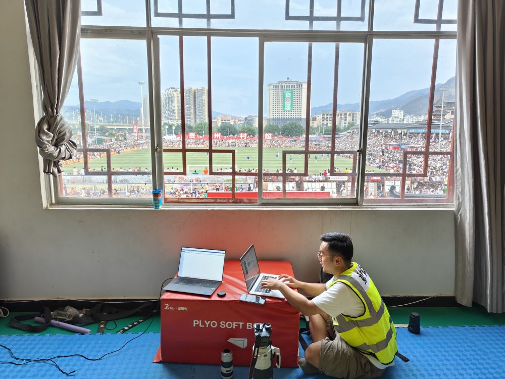↑ 2023年7月29日,新华社记者欧东衢在“村超”总决赛现场旁发稿。