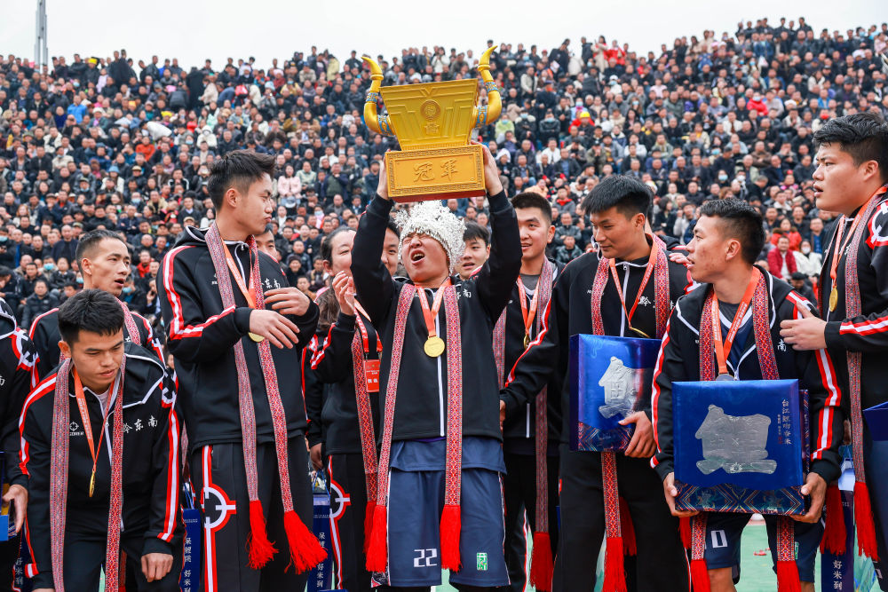 ↑ 2023年3月27日,冠军黔东南州代表队在“村BA”颁奖仪式上高举奖杯庆祝。