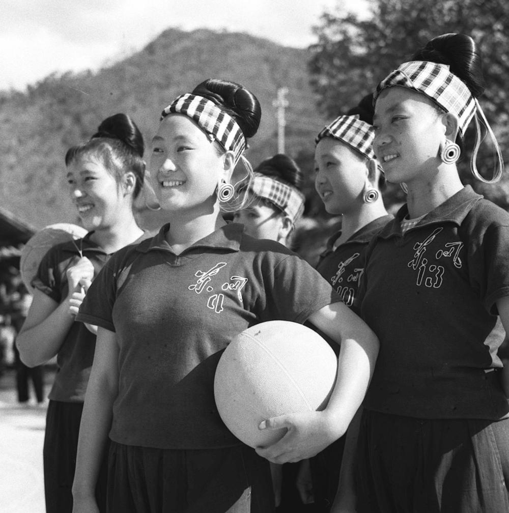 ↑ 这张拍摄于1972年的照片显示的是贵州省台江县的苗族女子篮球队,她们经常利用劳动间隙开展体育活动,每逢节假日还常和附近的社队、学校进行友谊比赛。新华社记者王翼南摄