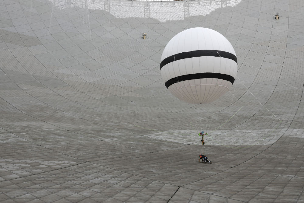 ↑ 2019年8月30日,“蜘蛛人”在反射面板上进行首次巡检实验。