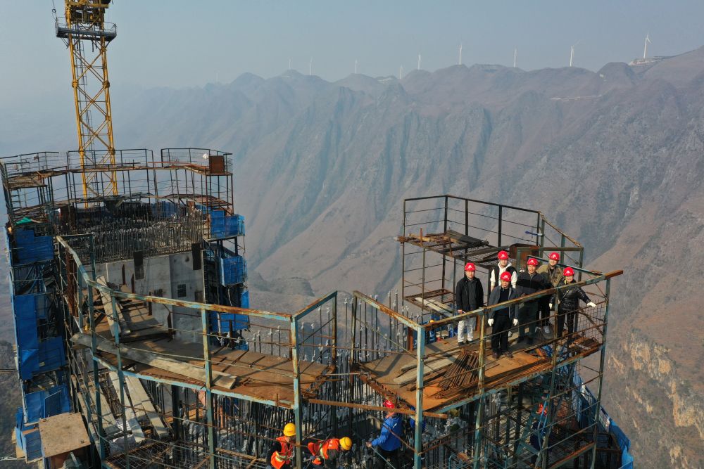 ↑ 2023年2月21日,新华社记者欧东衢(右二)与同事在花江峡谷大桥施工现场采访。