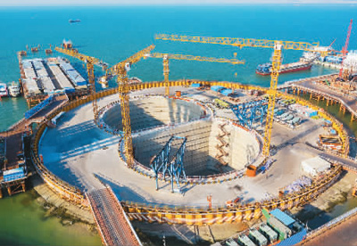 钢圆筒在海水之下“手牵手”围成一个人工湖,排水、填筑作业后,伶仃洋上逐渐形成了一座坚实的岛屿。2017年9月18日,最后一根钢圆筒振沉完成,西人工岛围堰结构完工。
