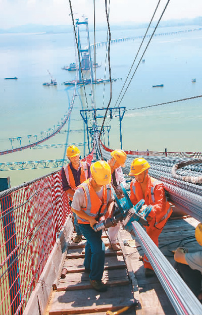 深中通道伶仃洋大桥建设者在架设主缆索股。中交二航局供图