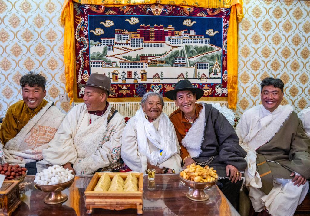 今年藏历新年,斯曲旺姆的儿女们带着各自的小家庭来甲根村团聚。孩子们依次给老人献上哈达,敬上青稞酒,被围坐在中间的斯曲旺姆,身边满是欢声笑语。
