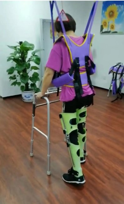 图为患者在穿戴支具和使用助行器的情况下开始行走。