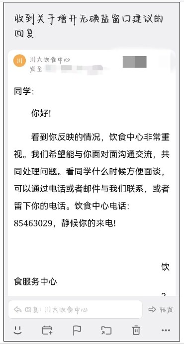 川大饮食服务中心的回信