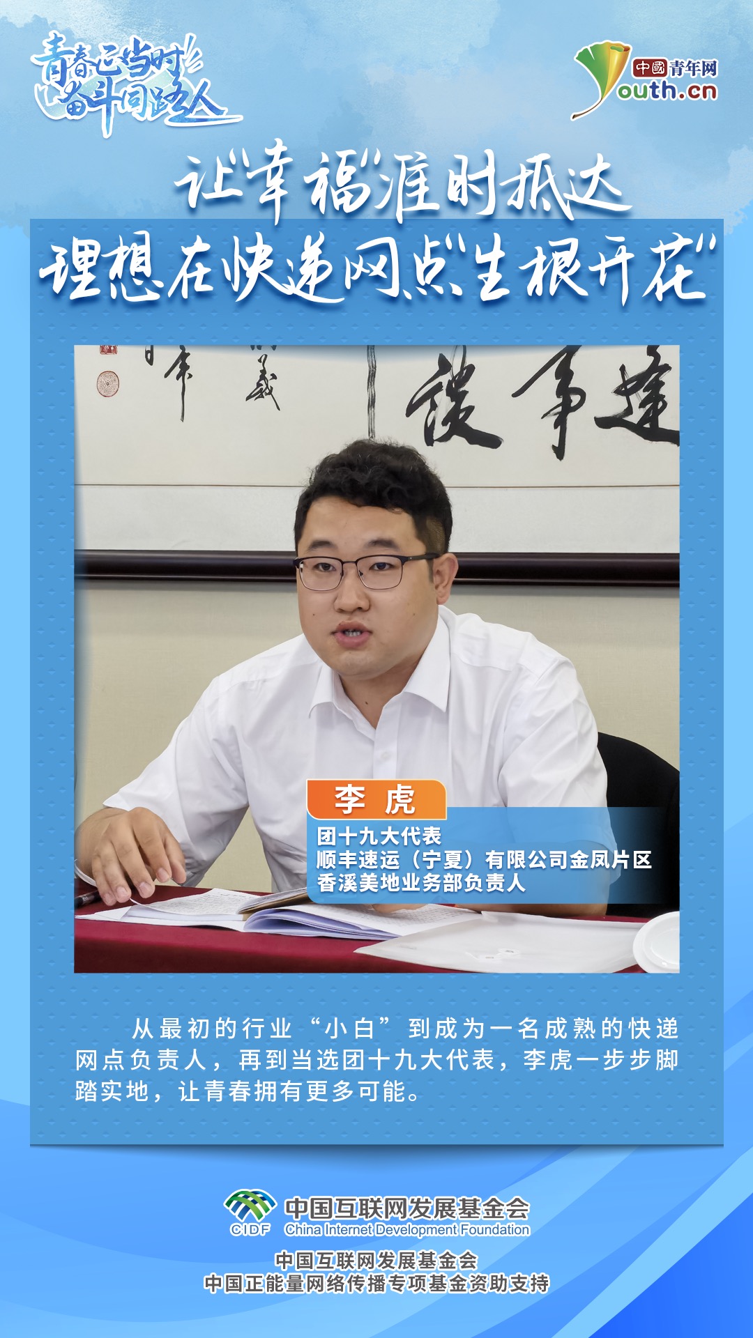 “我当时选择这个行业是因为看到了它对应届毕业生的利好规划和培养方向。”与刻板印象不同,毕业于宁夏大学的李虎选择加入快递服务行业,向下扎根、向上生长。三年时间,从最初的行业“小白”到成为一名成熟的快递网点负责人,再到当选团十九大代表,李虎一步步脚踏实地,让青春拥有更多可能。