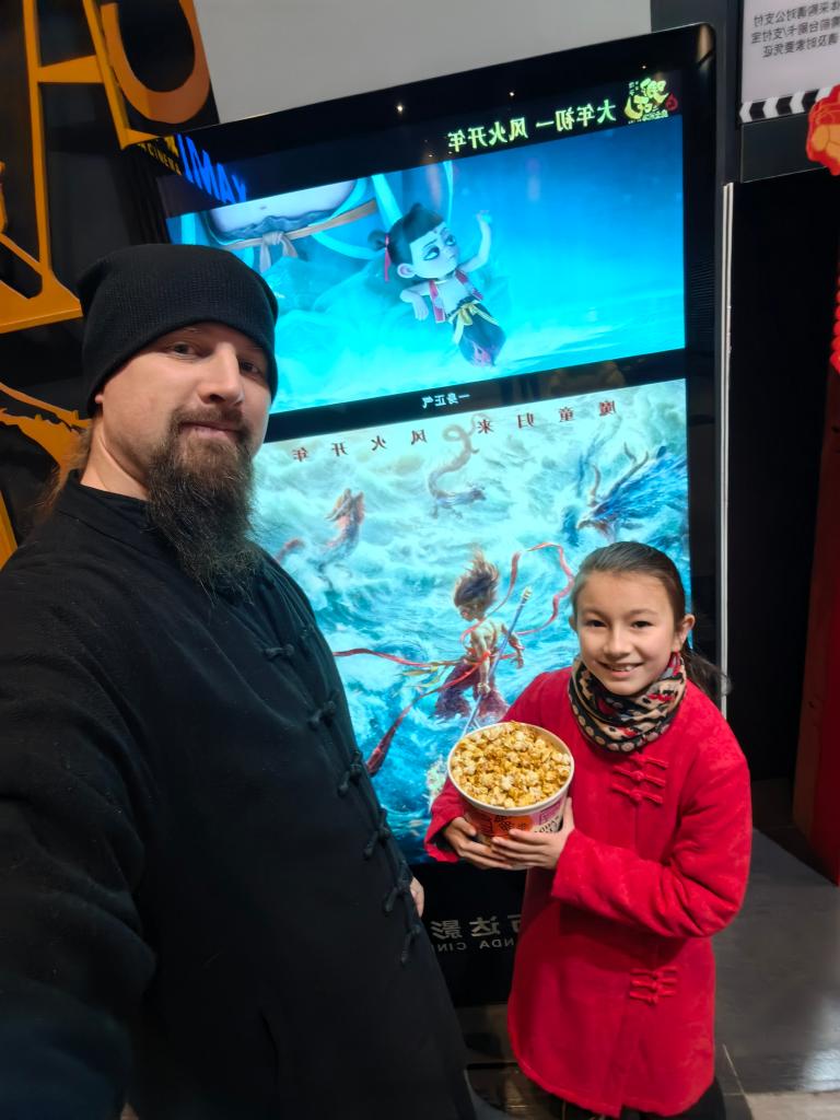 2月12日,杰克和女儿在《哪吒2》海报前合影。受访者供图