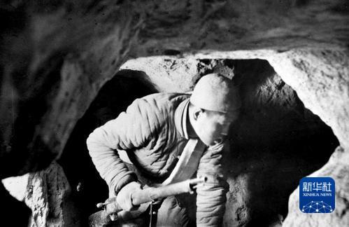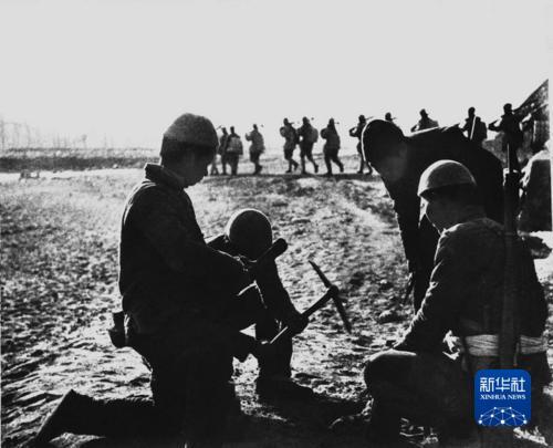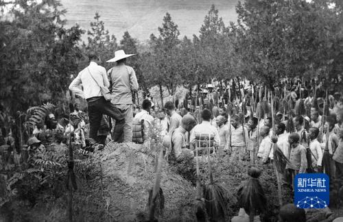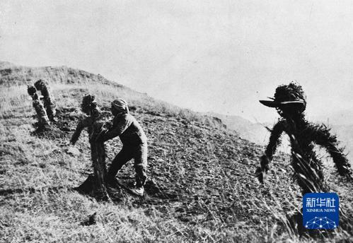 民兵在山顶上扎草人,用来迷惑敌人。沙飞 摄