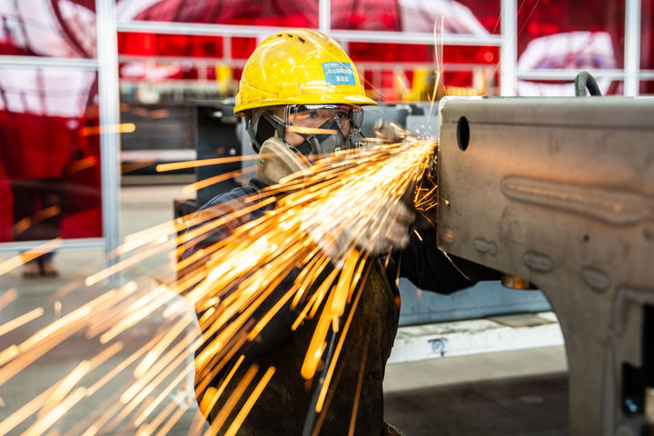 2025年2月7日,在湖南宁乡,湖南星邦智能装备股份有限公司工人在生产车间里打磨零部件。新华社记者 陈思汗 摄