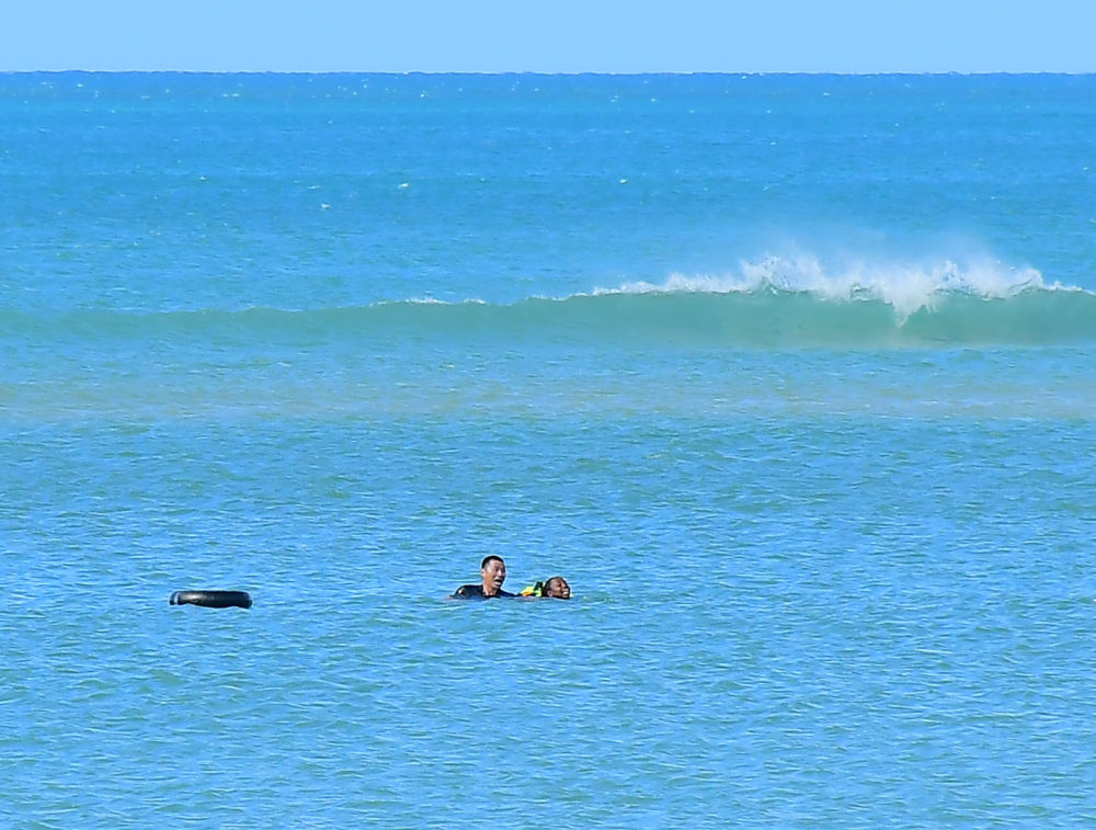 ↑2025年6月15日,在坦桑尼亚达累斯萨拉姆市海边,张军桥(左)在营救溺水的当地女子。 新华社发
