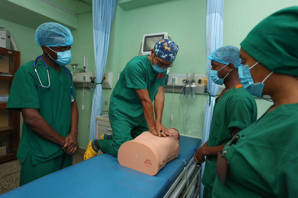 ↑↓2025年5月9日,在坦桑尼亚达累斯萨拉姆穆欣比利国立医院,张军桥医生(左二)示范心肺复苏急救。 新华社发(埃马纽埃尔·赫尔曼摄)
