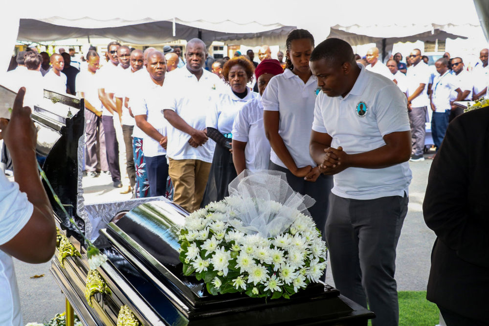 ↑2025年6月20日,在坦桑尼亚达累斯萨拉姆穆欣比利国立医院,人们在追悼会上向张军桥医生遗体告别。新华社发