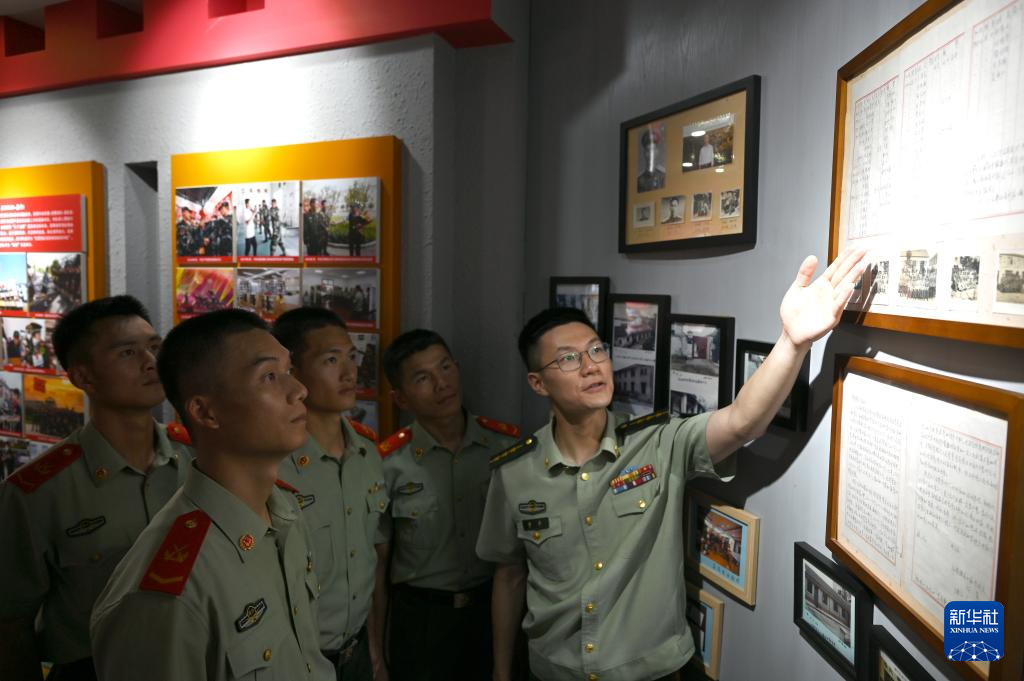 武警浙江总队宁波支队镇海中队指导员在荣誉室为新任职班长骨干讲述花名册背后的故事(6月21日摄)。新华社发(卫晨 摄)