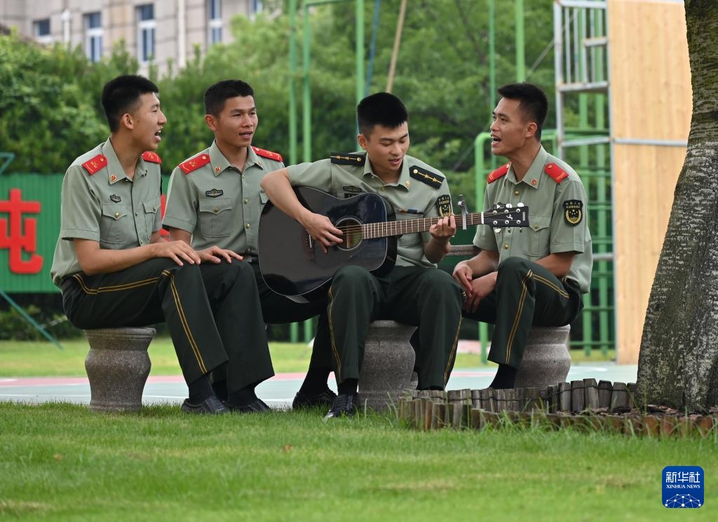 武警浙江总队宁波支队镇海中队官兵休息时间在营区演唱原创队歌《归零》(6月24日摄)。新华社发(卫晨 摄)