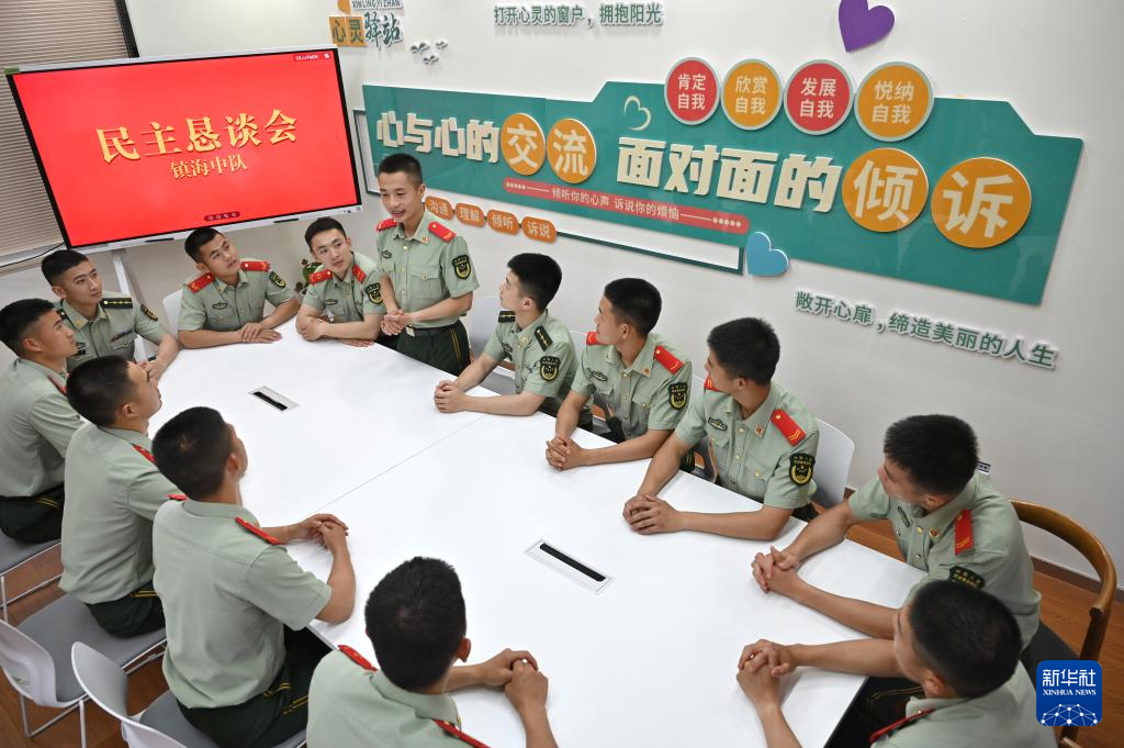 武警浙江总队宁波支队镇海中队组织官兵召开民主恳谈会(6月24日摄)。新华社发(卫晨 摄)