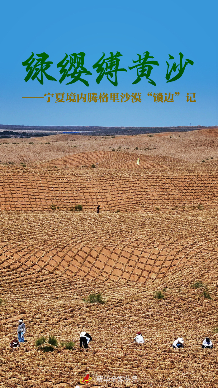 6月30日11时30分许,在宁夏中卫市沙坡头区长流水村,工人们将最后一米草方格扎进沙子,宁夏境内腾格里沙漠固沙锁边带最后的缺口被补齐,一眼望去,无数草方格像一张巨网,缚住连绵起伏的沙丘。