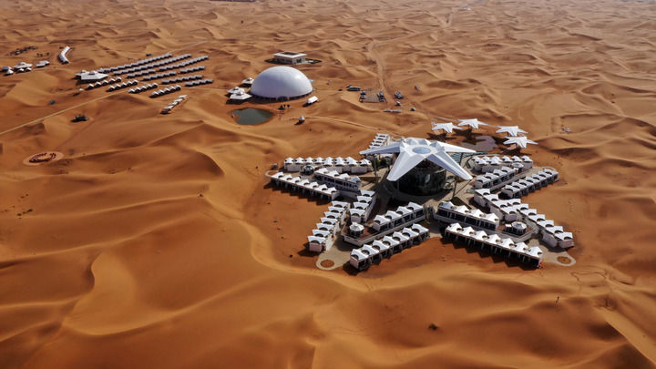 中卫市沙坡头景区腾格里沙漠星星酒店(2023年7月20日摄,无人机照片)。新华社记者 王鹏 摄