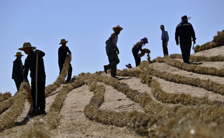6月30日,治沙工人在位于宁夏中卫市长流水村的腾格里沙漠东南缘扎草方格。新华社记者 王鹏 摄