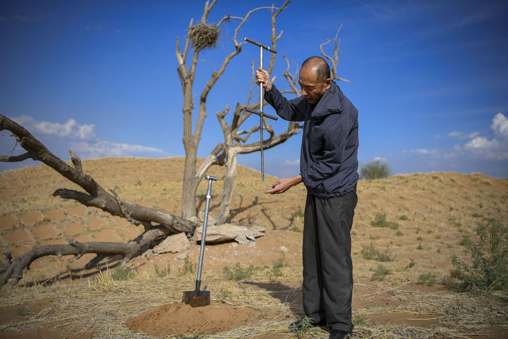 用铁锹将干草扎进沙里,地面保留15到20厘米自然竖立,这一米见方的草方格看似简单,但寸草可遮丈风。桀骜不驯的流动沙丘被牢牢钉住,其间草木渐次繁荣,绿意从斑驳连成一片。