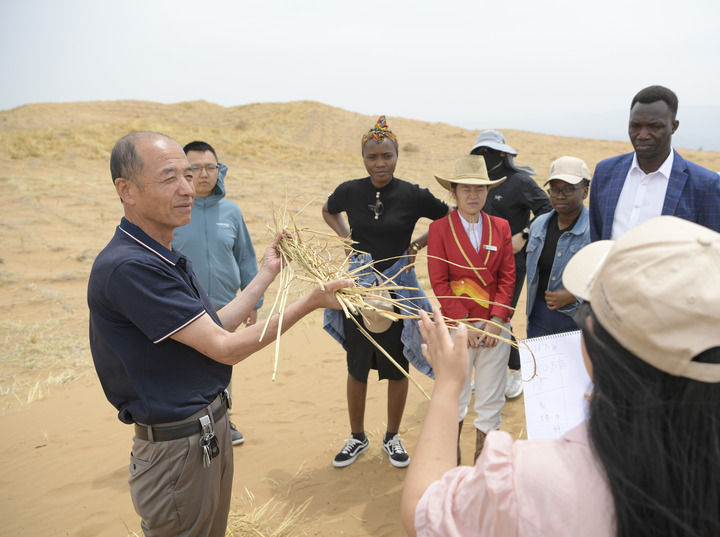 2024年5月31日,中卫市西郊林场场长唐希明(左一)向参加“全球发展青年领袖之家”中国行活动的多国青年介绍草方格使用的麦草。新华社记者 冯开华 摄