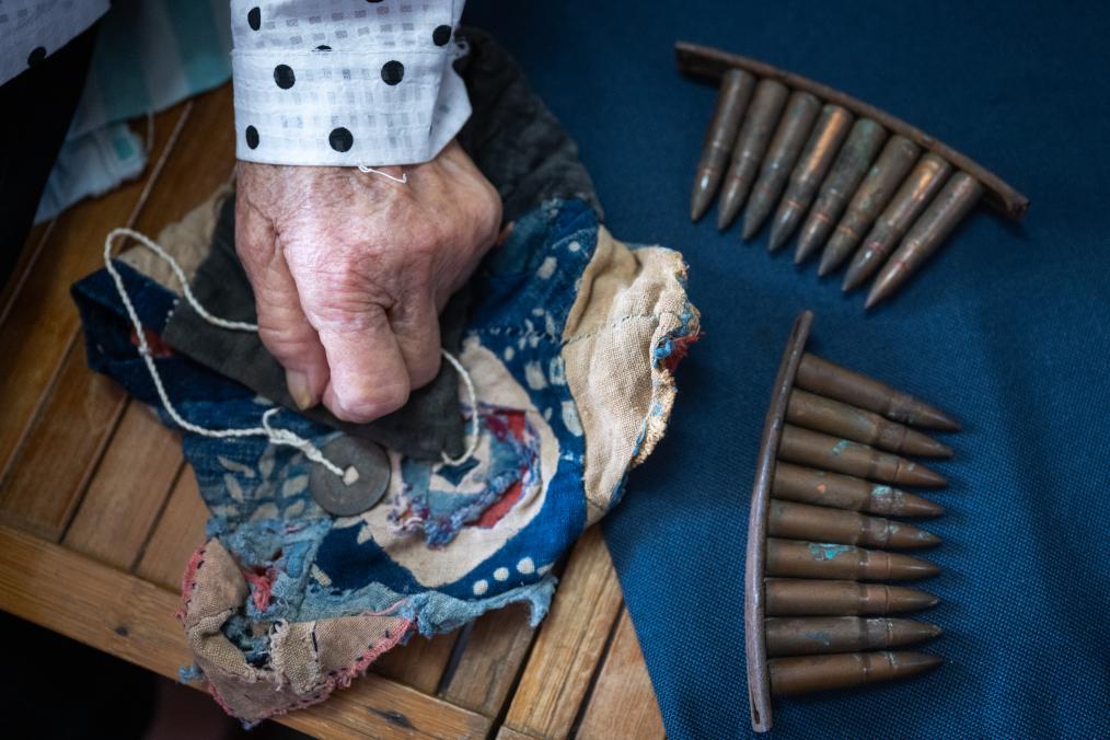 “从我记事起,就没见过我的爸爸,妈妈也只见过两次面,他们的故事都是妈妈和旁人讲给我听的。”今年86岁的黄延安坐在老屋堂屋里的竹床上,捧着妈妈留下的红蓝色旧布包,颤巍巍地打开,摩挲着生锈的子弹夹——这是父亲留给自己唯一的遗物。