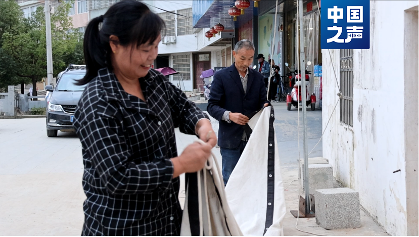 下午四点,夫妻俩开始忙活,盘整放映设备,把音响、银幕、放映机,一件件装车。下午五点半,他们到达放映的地方,麻利地安装起银幕架子。看电影的场面没有了多年前的壮观,搬着小板凳、小马扎来看电影的,大都是老人和小孩。