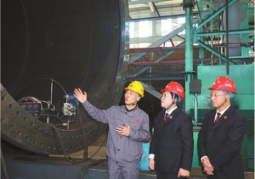 周晓龙(左)向哈尔滨市道外区检察院检察长程立华(中)介绍由他焊接的大型钢管。