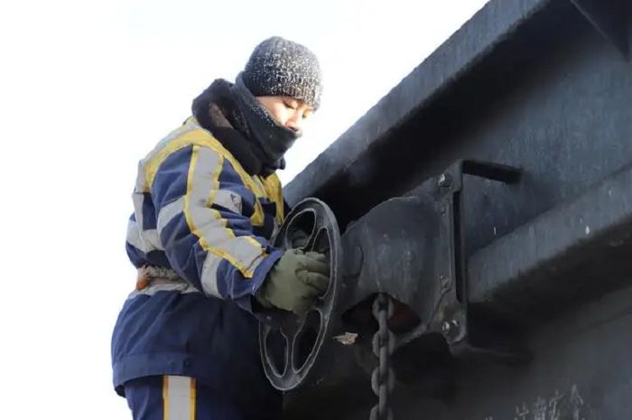 2023年12月25日,在国铁哈尔滨局集团有限公司加格达奇车务段漠河站,调车长在进行止轮作业。新华社记者 金地 摄